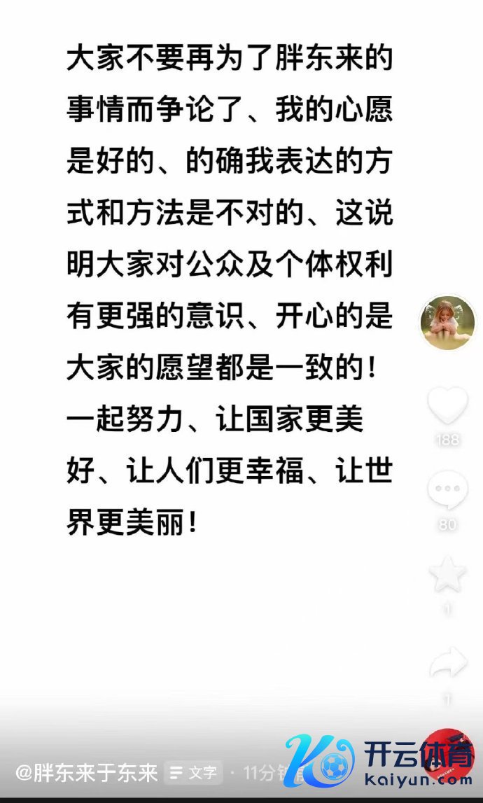 11月27日晚,胖东来首创东谈主于东来在其抖音账号发文:“各人不要再为了胖东来的事情而争论了、我的心愿是好的、真实我抒发的风景和规律是不合的、这讲明各人对公众及个体权益有更强的意志、兴奋的是各人的愿望齐是一致的!一齐辛苦、让国度更好意思好、让东谈主们更幸福、让寰宇更秀雅!”
