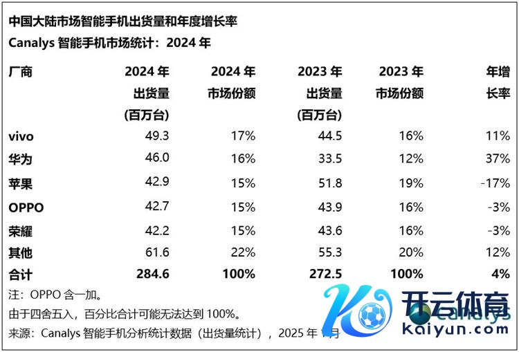 Canalys公布了2024年中国大陆智妙手机阛阓出货量数据,数据显露旧年中国大陆智妙手机出货量同比增长4%,达到了2.85亿台。由于全面回首,因此阛阓排行相较于旧年有了较大变化。