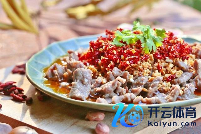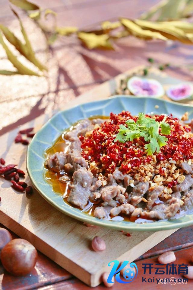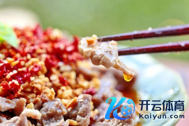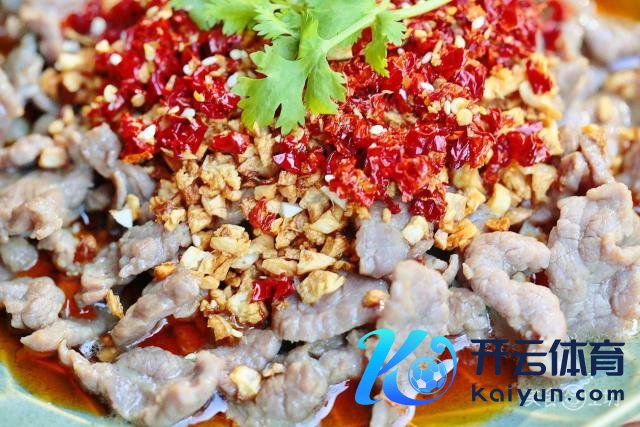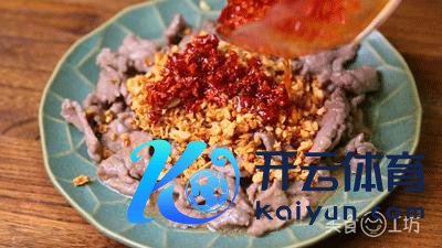 4. 在牛肉上循序撒上炸酥脆的蒜末和油辣子,食用前拌匀更香。