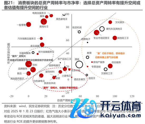 因此,咱们盘算推算了各个消费子板块的ROE与其总钞票盘活率和销售净利率的关系,发现包括很多行状消费(文化文娱、概述行状、旅游失业、餐饮货仓)和商品消费(饮料、食物、白电、家居)在内的子板块其实皆具备这么或者依靠“量”的回升而实现ROE回升的特征,其中,若是估值(市净率)处于历史核心以下,或估值历史分位数依然低于总钞票盘活率的分位数,那么这一类行业则更有契机在异日的消费量企稳中取得盈利和估值的双击: