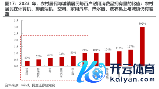 更雄伟群体的增收与保障战略推出,故意于挖掘更大的消费后劲。当消费支拨比例普实时,与其他消费者群体差距收支较大的分项可能是普及的要紧对象,举例,从耐用品消费来看,农村住户相对于城镇住户,在盘算推算机、排油烟机、空调、家用汽车、滚水器、洗衣机上的户均保有量差距较大,可能是收入和保障普及后首选的消费“升级”技俩;从消费支拨合座分项来看,农村住户在其他用品及行状、行状性消费、穿戴、生存用品及行状、考验文化文娱上相对城镇住户而言的差距较大,也低于合座消费支拨与城镇住户的比值,这些偏“行状类”的消费可能是异日收入和保障差距贬低下,有增量消费群体的规模。