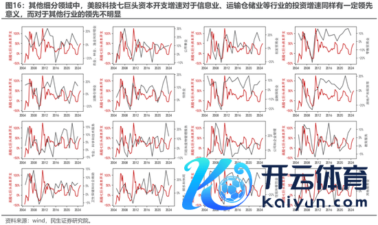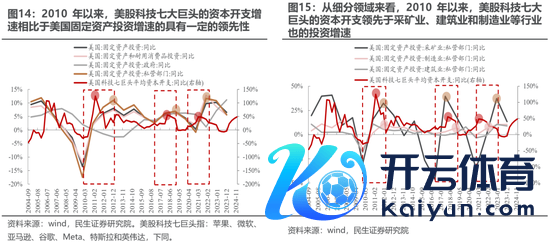 参考好意思国训诫来看,2010年以来,好意思国科技巨头成本开支增速的大幅回升对于经济总量层面的投资增速回升具有雷开心念念。具体而言:2010年以来,好意思国七大巨头的成本开支增速的回升常常高出于好意思国合座投资增速的回升,而好意思国七大巨头的成本开支增速的见顶回落同样高出于好意思国合座投资增速的回落。更进一步的,从细分规模看,咱们发现,好意思国七大巨头的成本开支增速的回升对于采矿业、建筑业、制造业、信息业、输送仓储业等规模的投资增速的高出意念念较为彰着。即好意思国科技巨头的成本开支的大幅回升,带来的作用频繁不限于其行业本人,而常常或者扩散至其他行业,并带来合座社会投资的回暖。