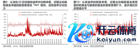 从参与者视角看,近期行情主要由个东谈主投资者(两融、龙虎榜等)主导,而主动偏股基金、北上资金以及ETF等投资者参与度一般。具体而言:一方面,2月以来,代表个东谈主投资者活跃的融资买入占比、以及龙虎榜贸易总数占比均有所回升,且两融彰着净买入A股;另一方面,北上资金举止合座反复,ETF被彰着净赎回,而主动偏股基金近期净值收益率中位数的剖判内容上彰着落伍于TMT板块,且分化彰着(龙套度大、且绩优与绩差基金差距变大)。
