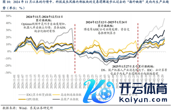 2024年11月以来的行情中,科技成长作风里面板块的来回逻辑渐渐从昔日的“外洋映射”走向内出产业趋势,由“好意思股巨头上游供应商”向“原土巨头”产业链扩容。2024年11至12月中旬,Optimus视频中奢睿手解放度增多,催化机器东说念主板块于11月末开启颓败行情,11月29日至12月11白天东说念主形机器东说念主指数酿成9连阳,累计涨幅达23.9%,其余AI板块分化相对有限;2024年中旬至2025年1月末,机器东说念主迎来调养,受ASIC公司事迹发酵等影响,科技成长作风里面轮动至推理侧算力,光模块、GPU施展隆起;春节以来,DS出圈、国产机器东说念主产业音问催化下,IDC、云设想等方针基于内出产业逻辑涨幅居前,2月以来差异高涨46%、30%。