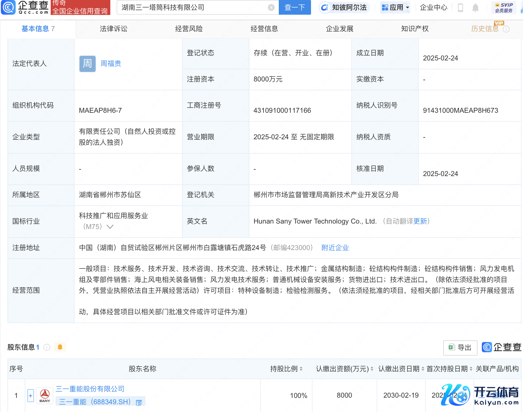 企查查APP暴露,近日,湖南三一塔筒科技有限公司配置,法定代表东说念主为周福贵,注册老本8000万东说念主民币,讨论边界包括风力发电机组及零部件销售、海优势电关系装备销售、风力发电本事管事、平淡机械开采安设管事等。企查查股权穿透暴露,该公司由三一重能(688349)全资握股。
