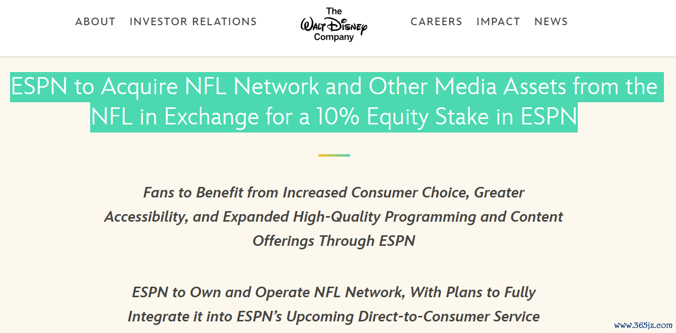 迪士尼和NFL并未公开此来往的具体价值,然则有分析师暗意,ESPN的估值在250亿到300亿好意思元,因此其10%的股权价值可达30亿好意思元。