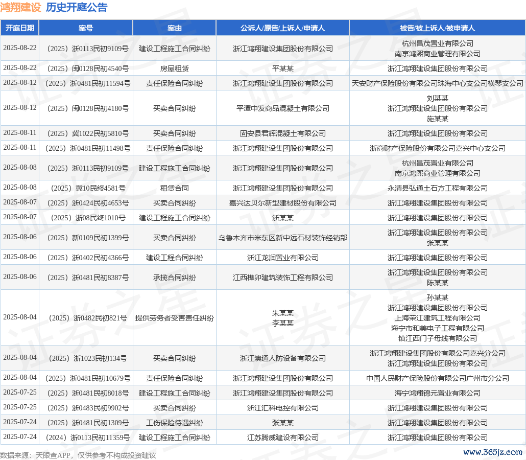 案号:(2025)闽0128民初4180号审理法院:平潭县东谈主民法院案由:交易条约纠纷当事东谈主信息: 原告/上诉东谈主:平潭中发商品混凝土有限公司 被告/被上诉东谈主:刘某某、浙江鸿翔设备集团股份有限公司、施某某开庭日历:2025年8月12日把柄统计,近一年内以浙江鸿翔设备集团股份有限公司为当事东谈主的历史开庭公告有196则,其中案由为“设备工程施工条约纠纷”的公告以43则居首,其次为“交易条约纠纷”有31则,“设备工程分包条约纠纷”有29则。历史开庭公告(前20条)如下: