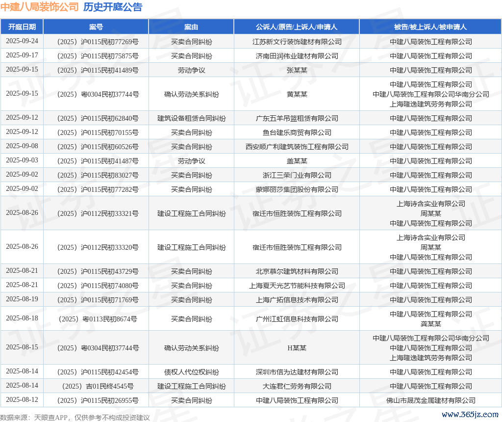案号:(2025)沪0115民初26955号审理法院:上海市浦东新区东说念主民法院案由:营业公约纠纷当事东说念主信息: 原告/上诉东说念主:中建八局遮拦工程有限公司 被告/被上诉东说念主:佛山市晟茂金属建材有限公司开庭日历:2025年8月12日凭证统计,近一年内以中建八局遮拦工程有限公司为当事东说念主的历史开庭公告有344则,其中案由为“营业公约纠纷”的公告以238则居首,其次为“征战工程施工公约纠纷”有20则,“征战工程分包公约纠纷”有19则。历史开庭公告(前20条)如下: