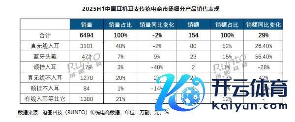 【CNMO科技音尘】9月9日,洛图科技最新数据涌现开云体育,2025年上半年,耳机耳麦在中国传统主流电商平台的销量为6494万副,同比下跌1.9%;销售额为154亿元,同比增长29%。其中,真无线悦耳耳机销量为3101万副,排第二。