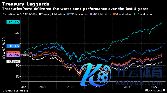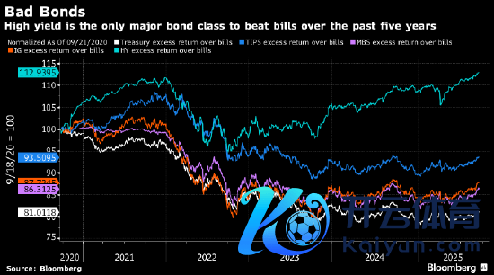 上头的图表展示了畴前五年好意思国各种债券(方法好意思国国债、TIPS、MBS、投资级、垃圾债)总答复。不错看到,方法好意思国国债在所有这个词类别中昭彰逾期。某种进度上这本应是料念念之中的,因为它们表面上是最安全的金钱,当然答复也最低。但“答复最低”和“在别东说念主答复率为零或转正时它还深陷负值”,语义上有不小的分手。