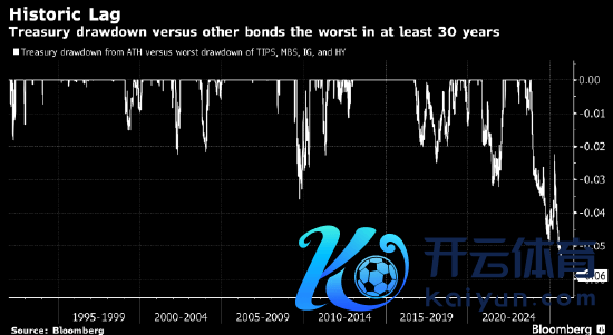 谜底很简略:莫得。上图透露的是彭博好意思国国债指数从历史高点的回撤情况,对比TIPS、MBS、投资级和高收益债的最大回撤。昭彰,这一轮是至少1992年以来好意思债联系于其他债券类别推崇最差的一次。我还专诚查了1972至1992年间,好意思国国债与投资级、MBS之间的相对推崇,也莫得出现过访佛的差距。